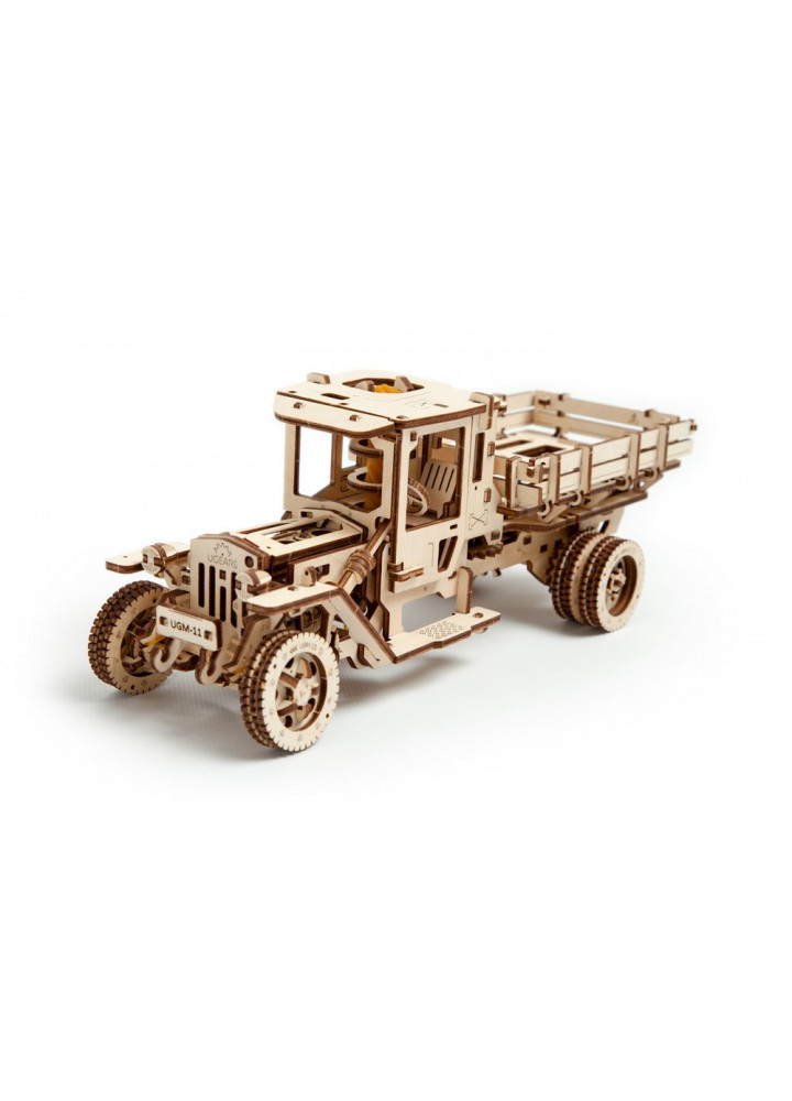 El camión UGM-11 pertenece a una nueva generación de maquetas mecánicas de UGEARS que presentan más características y sofisticación. Esta maqueta funciona, se conduce, se dirige y acelera como un camión real. Primero, se “llena el depósito” girando la palanca situada encima de la cabina. Luego, se “arranca” el motor con la palanca de cambio en “punto muerto” y vemos los cuatro pistones moverse de forma realista debajo del capó plegable. Al abrir la puerta de la cabina, se descubrirá un volante totalmente funcional y hasta un pedal de acelerador operativo. ¿Listo para un viaje? Ponga la marcha “adelante” o “atrás” y mire cómo su camión se acerca al campo para recoger un nuevo cargamento de heno.