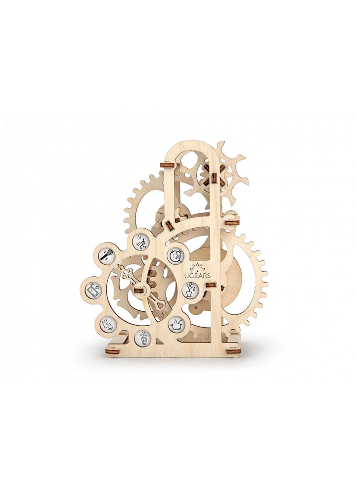 El dinamómetro es una de las maquetas más sencillas de UGEARS, pero al mismo tiempo muestra varios principios básicos de la mecánica, tales como el tren de engranajes y la unión mecánica llamada cruz de Malta.