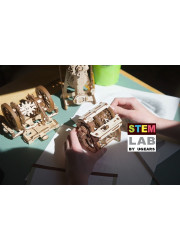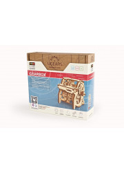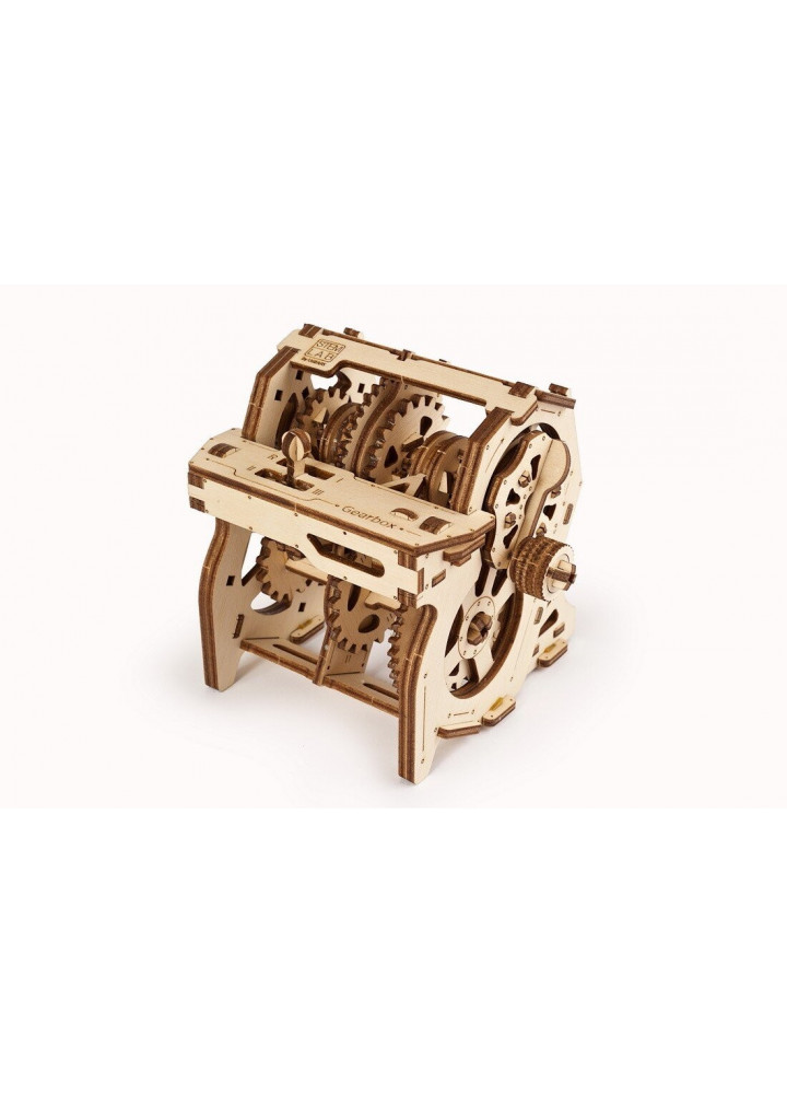 La caja de cambios es una maqueta didáctica estilizada, una herramienta de estudio interactivo del mecanismo, con el único fin de aprender sus fundamentos y principios de funcionamiento. Una caja de cambios mecánica es un reductor que convierte el par motor y transmite la velocidad del motor a las ruedas motrices. Tras montar la maqueta, podrá experimentar con la caja de cambios manual Ugears, metiendo sucesivamente la 1ª, 2ª, 3ª y marcha atrás con un par de engranajes deslizantes con distinta relación de transmisión y, girando el accionador en el sentido de las agujas del reloj, podrá observar y controlar la velocidad de rotación del árbol primario y del secundario.